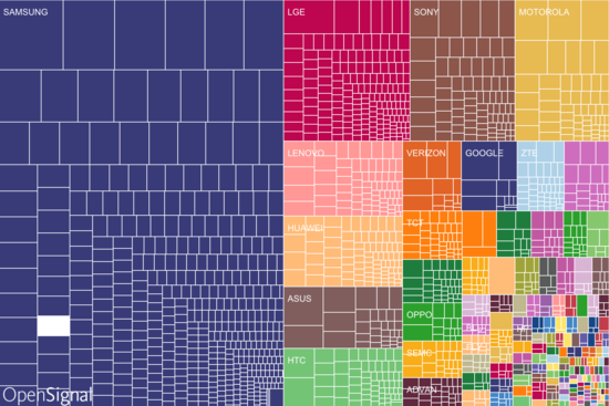 圖中最大的變化不是三星的主要競爭對手擴展了多少份額,而是上百家小型廠商的出現。OpenSignal表示發現了1294家獨立生產商,其中超過1000家在2012年的時候還根本不存在。值得注意的是,一些2012年還存在的廠商現在已經消失了,所以我們看到的增幅或許沒有那么大。